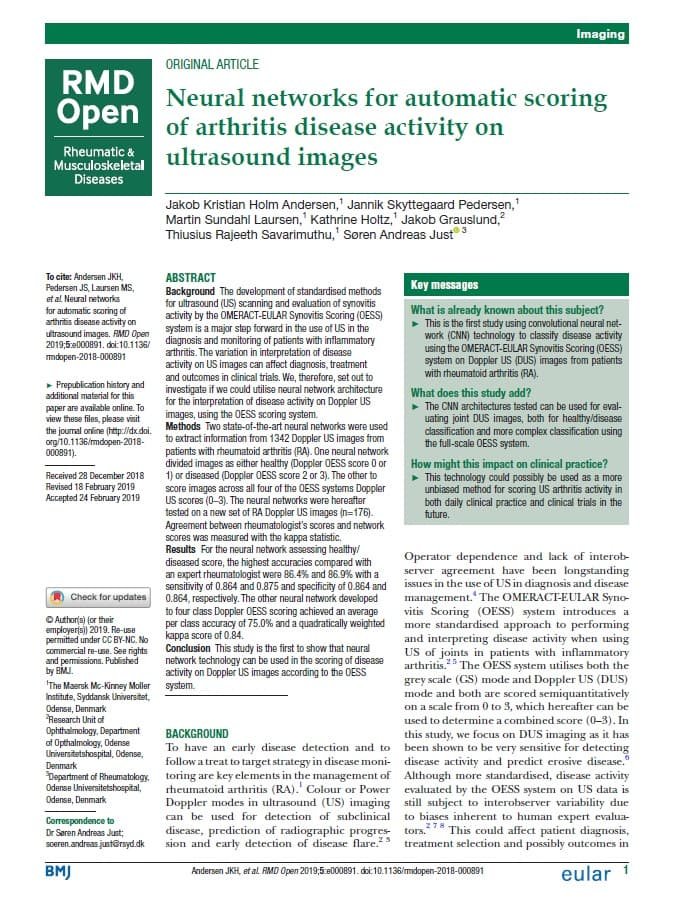 These results demonstrated that CNNs can effectively evaluate joint US images, potentially providing a more unbiased method for scoring US arthritis activity. This technology could enhance consistency in clinical assessments and trials, particularly in settings with limited access to musculoskeletal imaging experts. The authors suggest further optimisation of CNN designs, including combining classifiers from different network layers and expanding the dataset to include more joints, which could improve performance and applicability in clinical settings.