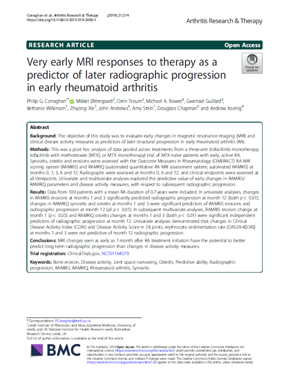 Conaghan PG, Østergaard M, Troum O, Bowes MA, Guillard G, Wilkinson B, Xie Z, Andrews J, Stein A, Chapman D, Koenig A. Very early MRI responses to therapy as a predictor of later radiographic progression in early rheumatoid arthritis. Arthritis Res Ther, 2019 Oct 21;21(1):214.