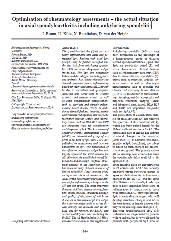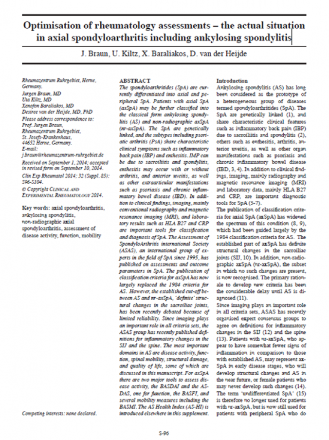 Braun J, Kiltz U, Baraliakos X, van der Heijde D. Optimisation of rheumatology assessments - the actual situation in axial spondyloarthritis including ankylosing spondylitis. Clin Exp Rheumatol, 2014 Sep-Oct;32(5 Suppl 85):S-96-104