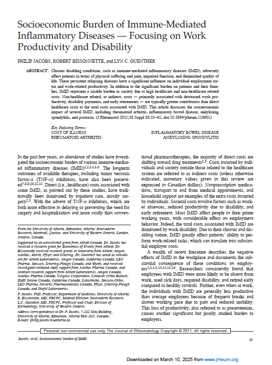 Jacobs P, Bissonnette R, Guenther LC. Socioeconomic burden of immune-mediated inflammatory diseases--focusing on work productivity and disability. J Rheumatol Suppl. 2011 Nov;88:55-61.
