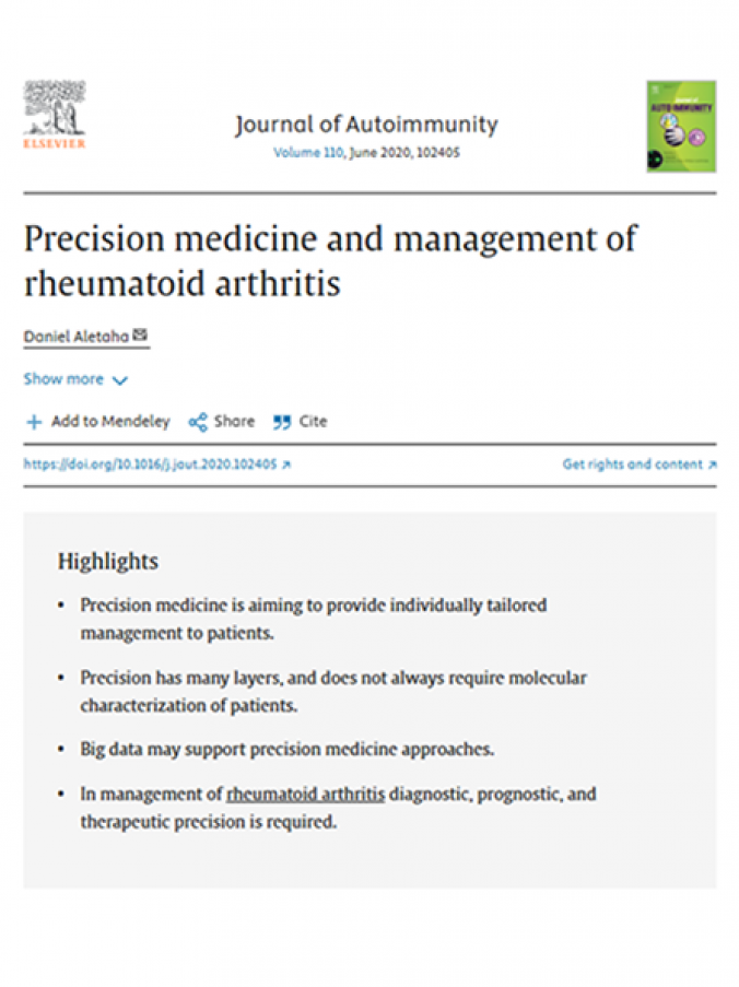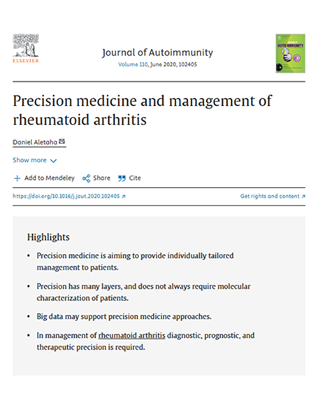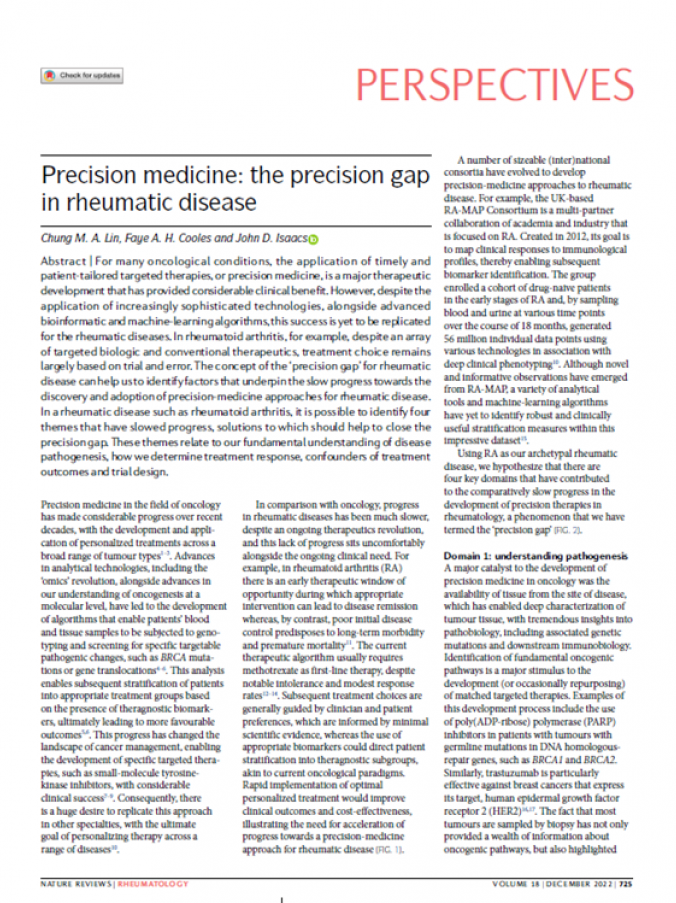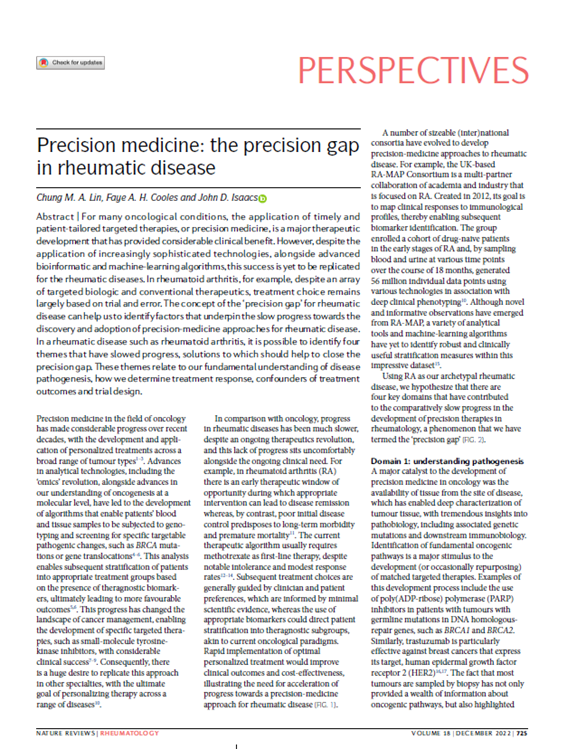 Lin CMA, Cooles FAH, Isaacs JD. Precision medicine: the precision gap in rheumatic disease. Nat Rev Rheumatol, 2022 Dec;18(12):725-733.