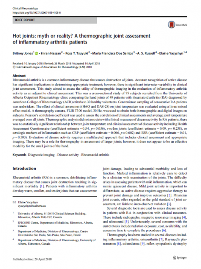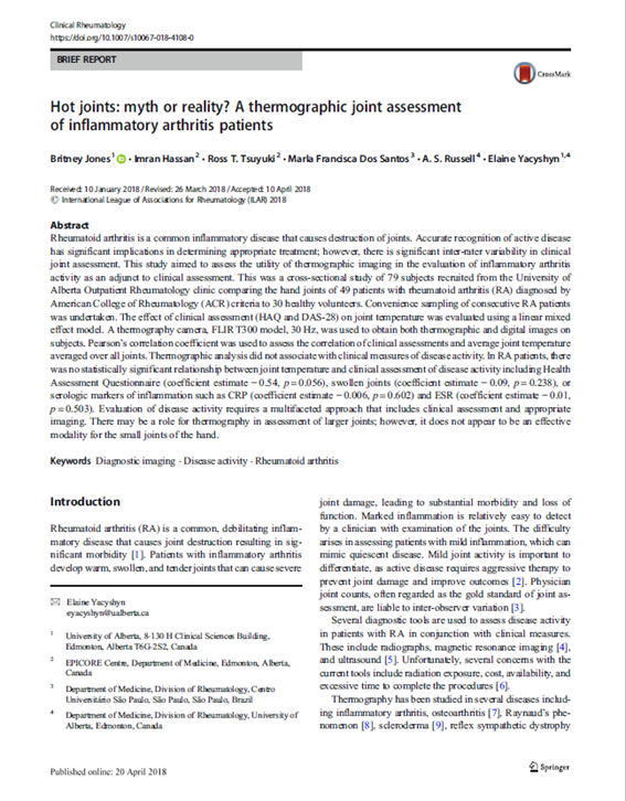 Jones B, Hassan I, Tsuyuki RT, Dos Santos MF, Russell AS, Yacyshyn E. Hot joints: myth or reality? A thermographic joint assessment of inflammatory arthritis patients. Clin Rheumatol, 2018 Sep;37(9):2567-2571.