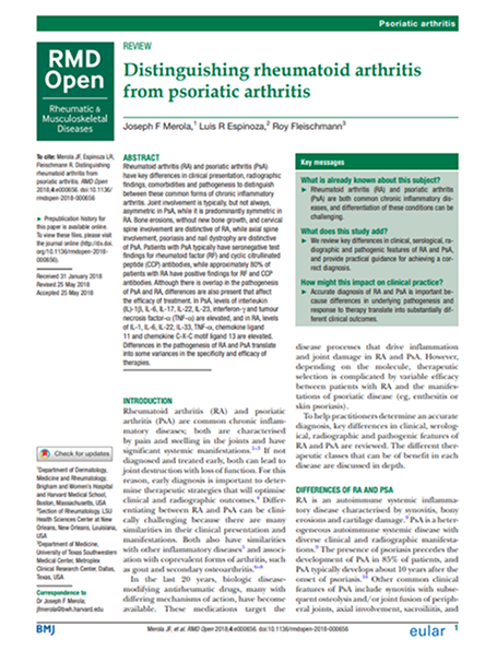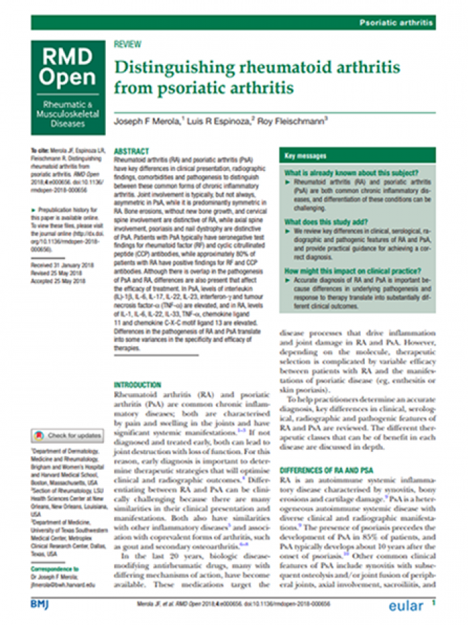 Merola JF, Espinoza LR, Fleischmann R. Distinguishing rheumatoid arthritis from psoriatic arthritis.