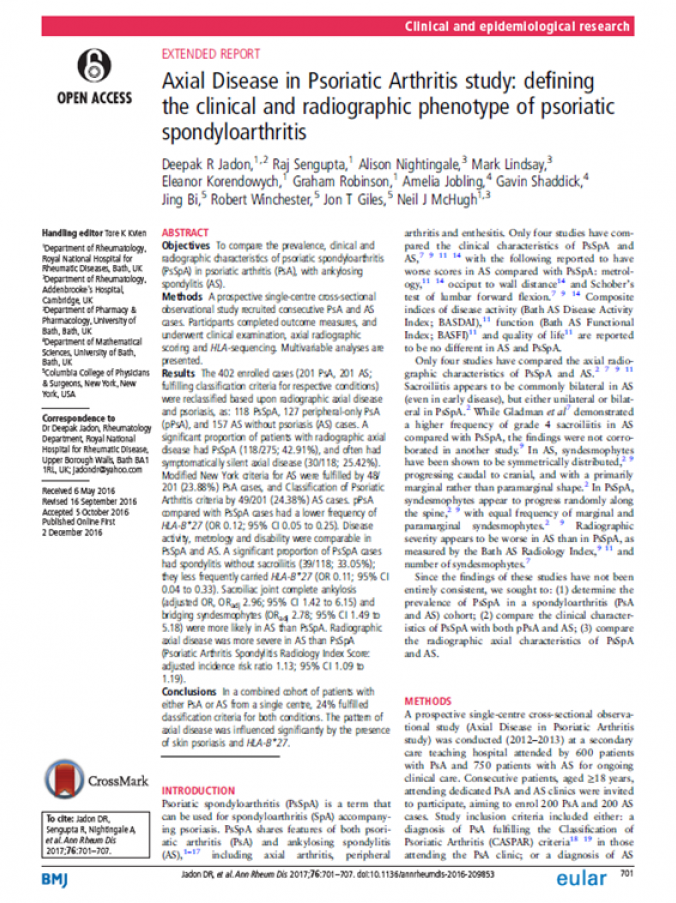 Jadon DR, Sengupta R, Nightingale A, Lindsay M, Korendowych E, Robinson G, et al. Axial Disease in Psoriatic Arthritis study: defining the clinical and radiographic phenotype of psoriatic spondyloarthritis. Ann Rheum Dis, 2017 Apr;76(4):701-707.